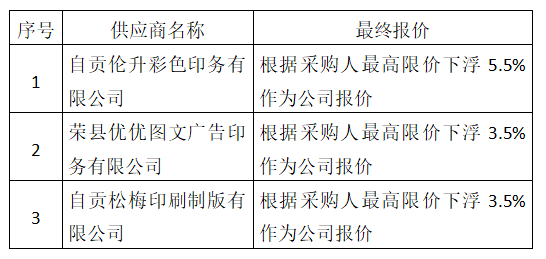 自貢市榮縣川投燃料有限公司于2023年6月12日,就2023年印刷服務(wù)項目進行競爭性談判,共有3家服務(wù)商參與競爭性談判。現(xiàn)就本次競爭性談判結(jié)果公示如下: