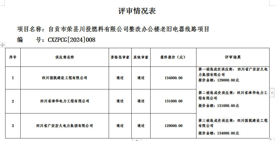 自貢市榮縣川投燃料有限公司整改辦公樓老舊電器線路項目 按照程序于2024年3月7日15時00分進行了競爭性談判,采購人通過談判小組推薦的成交候選人名單確定了成交供應(yīng)商,現(xiàn)將結(jié)果公示如下: