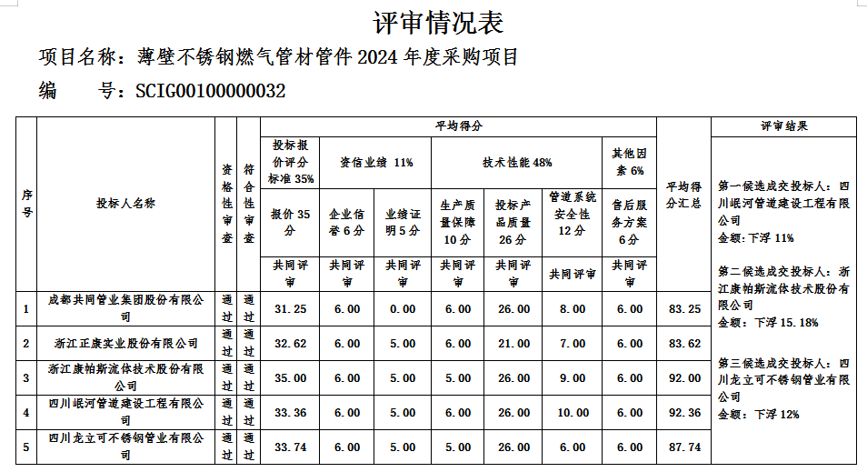 薄壁不銹鋼燃氣管材管件2024年度采購項目按照程序于2024年4月22日10時00分進行了公開招標,采購人通過評標小組推薦的中標候選人名單確定中標供應(yīng)商,現(xiàn)將結(jié)果公示如下: