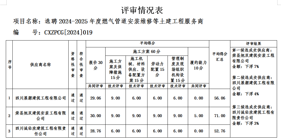 采購人按照程序于2024年6月3日10時(shí)00分進(jìn)行了選聘2024-2025年度燃?xì)夤艿腊惭b維修等土建工程服務(wù)商的競(jìng)爭性磋商,磋商小組通過推薦的成交候選人確定成交供應(yīng)商,現(xiàn)將結(jié)果公示如下: