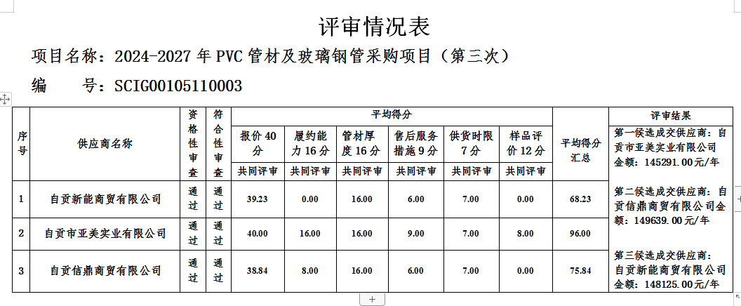 2024-2027年PVC管材及玻璃鋼管采購項目(第三次)按照程序于2024年6月12日9時30分進行了競爭性磋商,采購人通過磋商小組推薦的成交候選人確定成交供應商,現(xiàn)將結果公示如下: