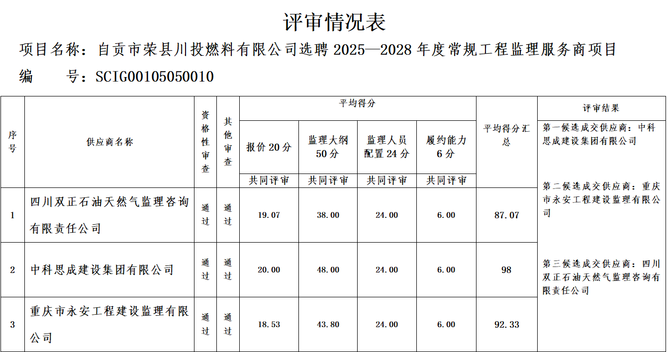 自貢市榮縣川投燃料有限公司選聘2025—2028年度常規(guī)工程監(jiān)理服務(wù)商項目結(jié)果公告