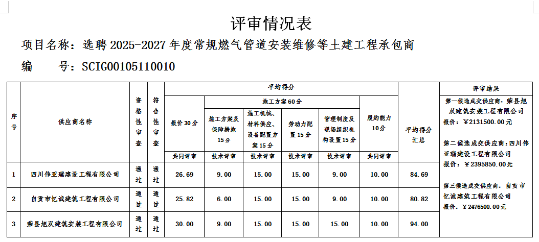選聘2025-2027年度常規(guī)燃氣管道安裝維修等土建工程承包商按照程序于2025年6月3日15時00分進行了競爭性磋商,采購人通過評審小組推薦的成交候選供應(yīng)商,現(xiàn)將結(jié)果公示如下: